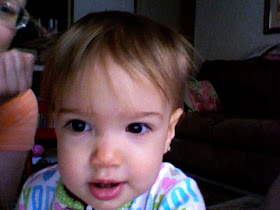 I've been with the girls for a night so that I could attend a bridal shower. It's always fun spending time with Punkin. We went to the local John Deere store and played on the toy tractors and then went out to eat. This morning I got up and got in the recliner because I felt that I was taking a headache when I heard a squeal. I kind of ignored it hoping that she would go back to sleep and curled up in the recliner with a blanket, then I heard it again followed by a whine so Gammy gave in and went to the room. She looked up over the edge of her crib and smiled real big, how could I resist. I picked her up and we snuggled in the recliner for a while until she started putting her fingers all over my face in places that they didn't belong. At this point I put her down on the floor to play. Oh the fun of being a grand-ma!!!